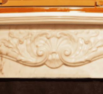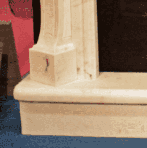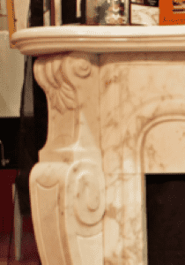 Caminetto in marmo di Carrara levigato e scalpellato con colonne e architrave sagomati e scolpiti