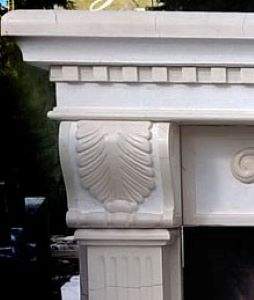 Caminetto in pietra d'Apricena levigata con colonne scanalate e lavorazioni a rilievo con fondo scalpellato