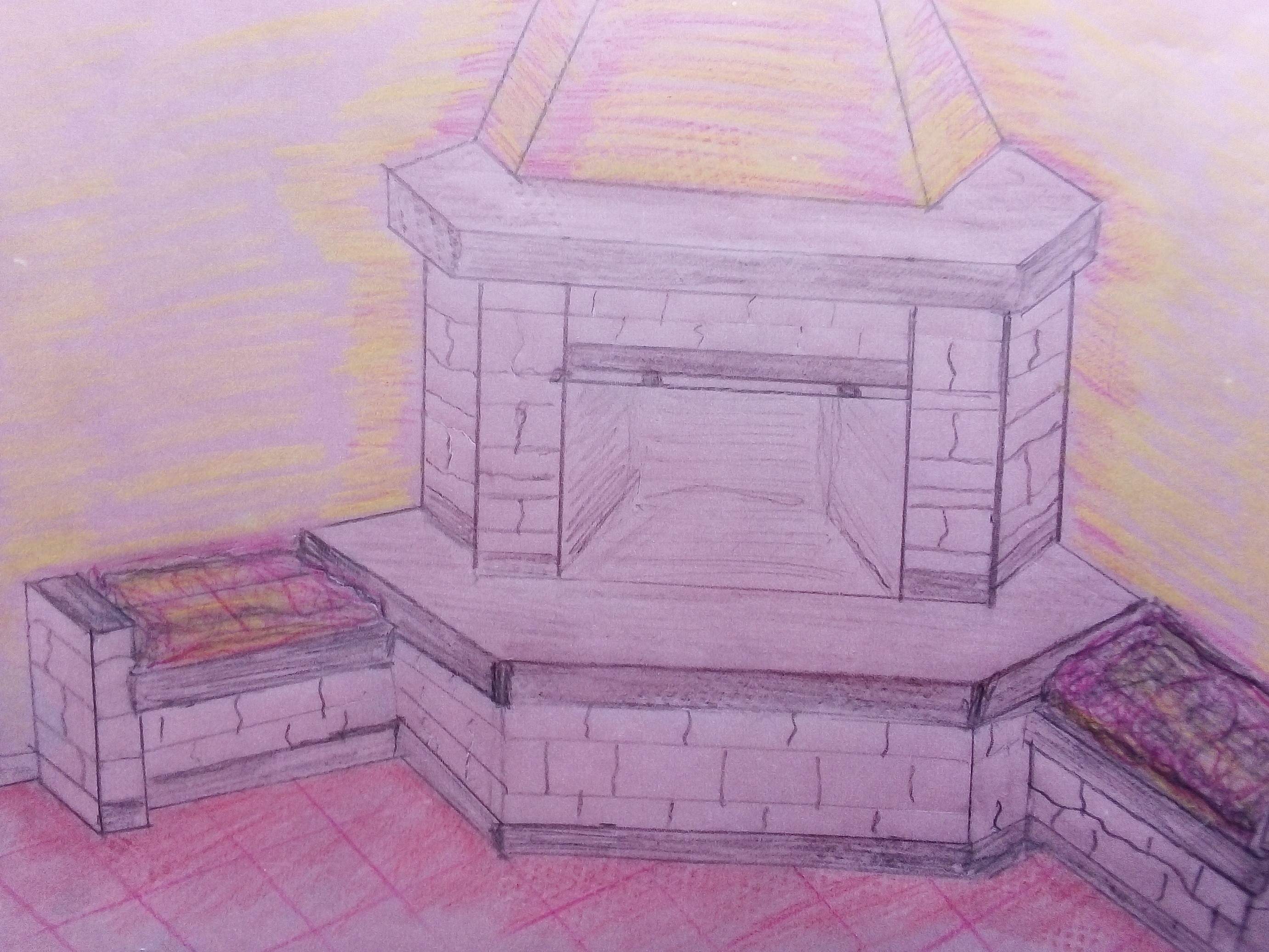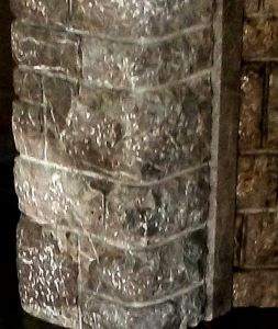 Caminetto ad angolo in pietra locale grezza con piano fuoco levigato