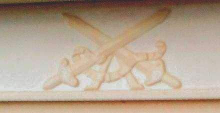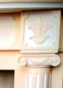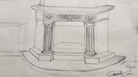 Caminetto in pietra di Trani scalpellata e levigata con colonne tornite e scanalate, architrave con stemma familiare a rilievo