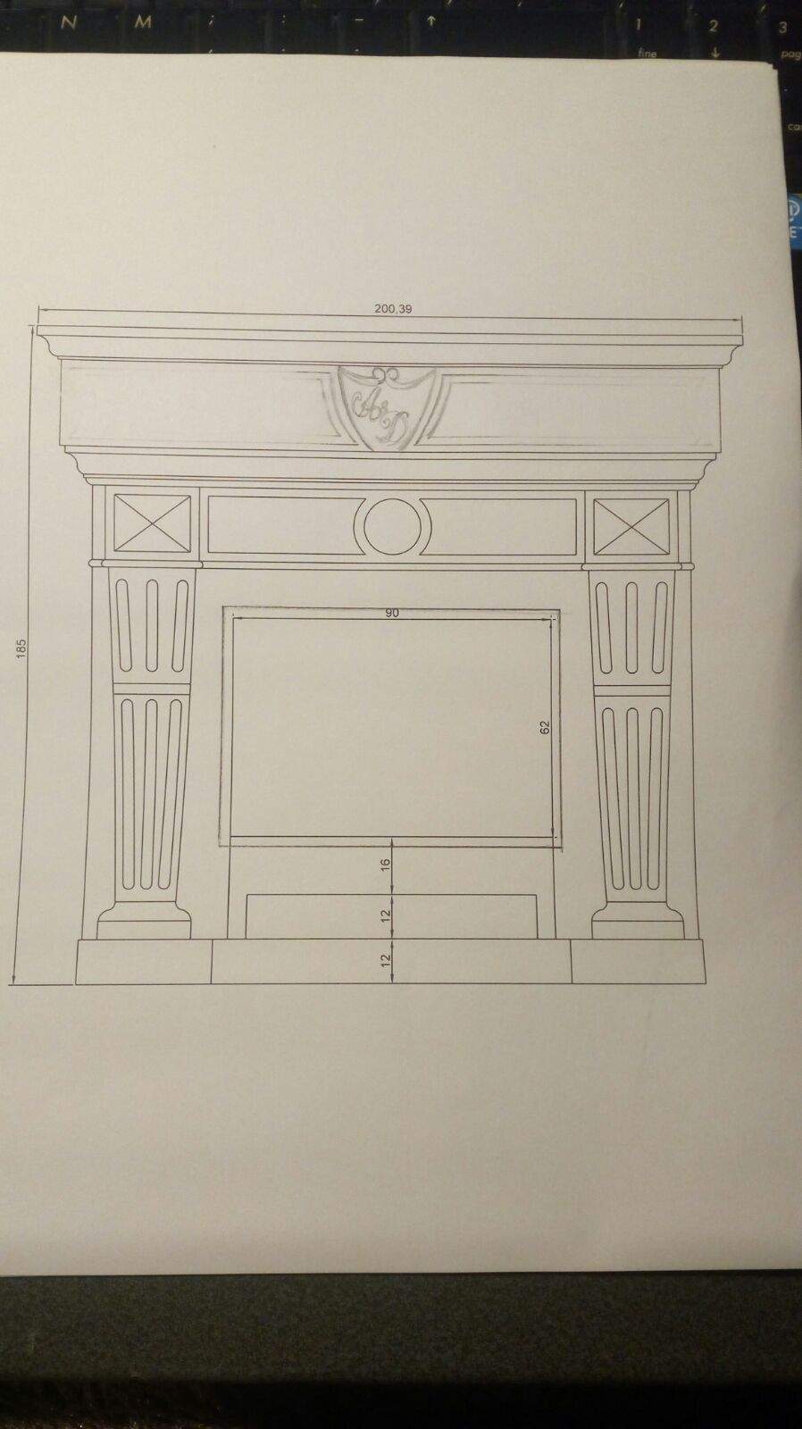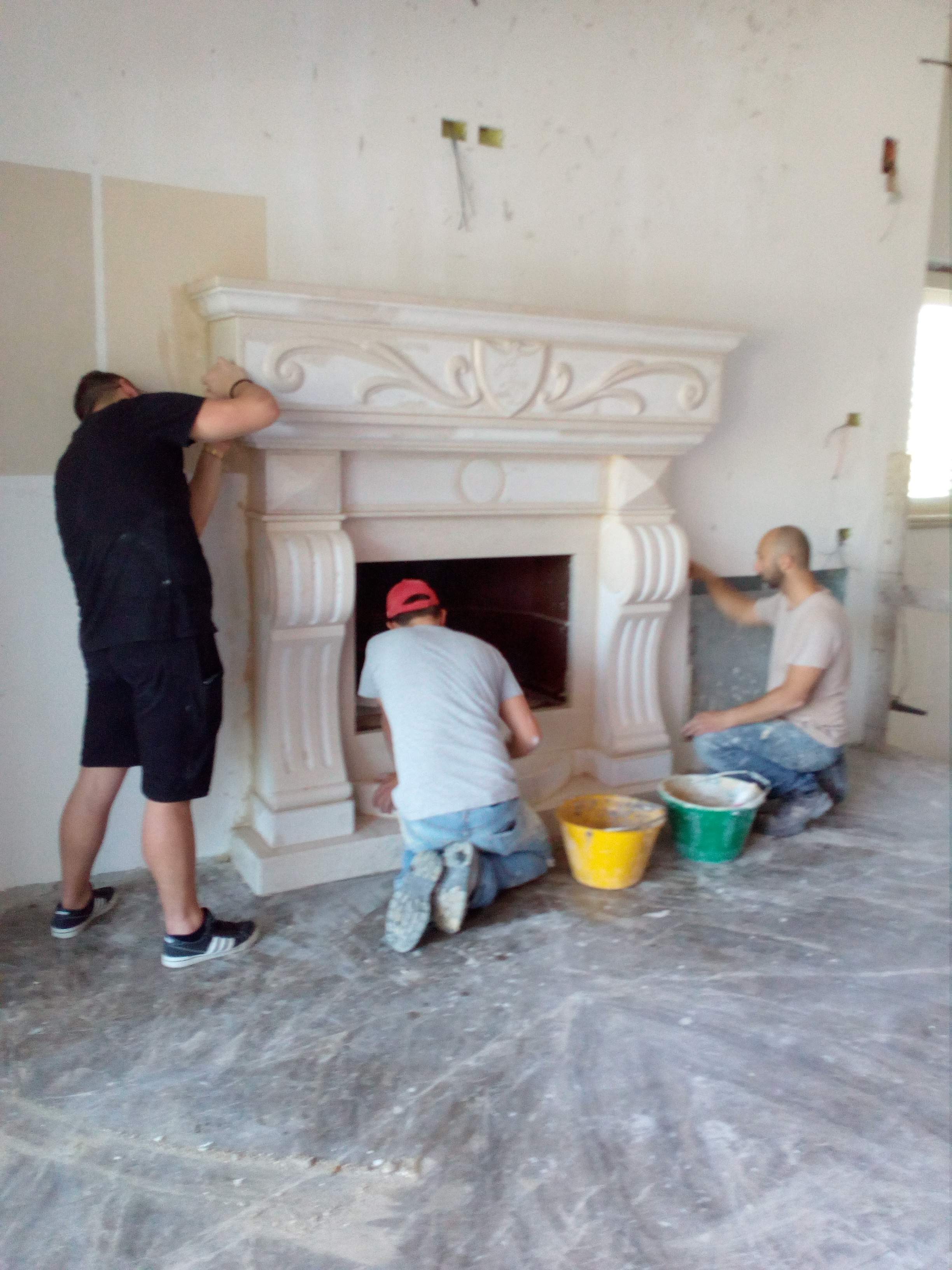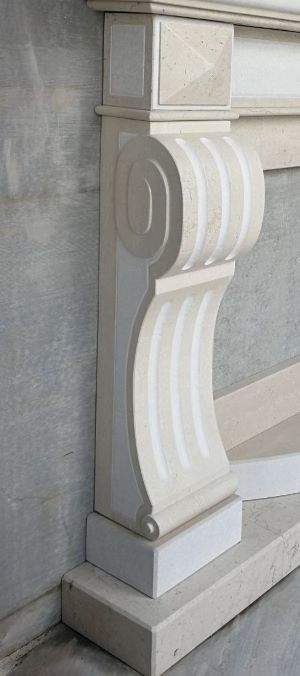 Caminetto in pietra d'Apricena scalpellata e levigata, con colonne sagomate e scanalate, architrave con stemma e iniziali