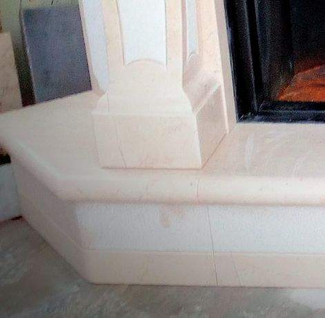 Rivestimento per caldaia su misura in pietra di Trani scalpellata e levigata con colonne sagomate e architrave con conchiglia in rilievo