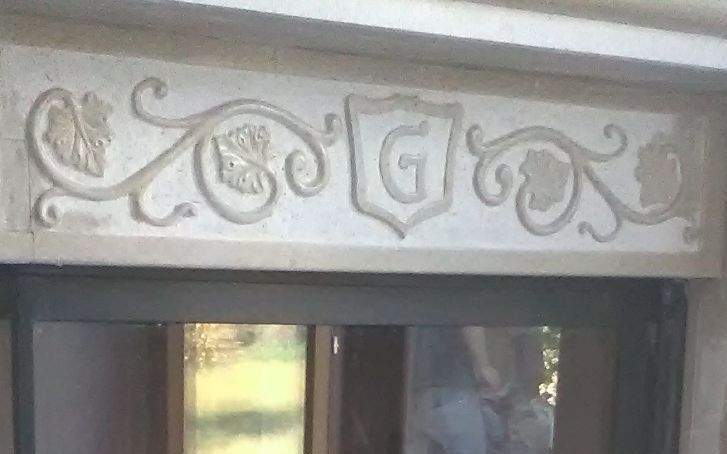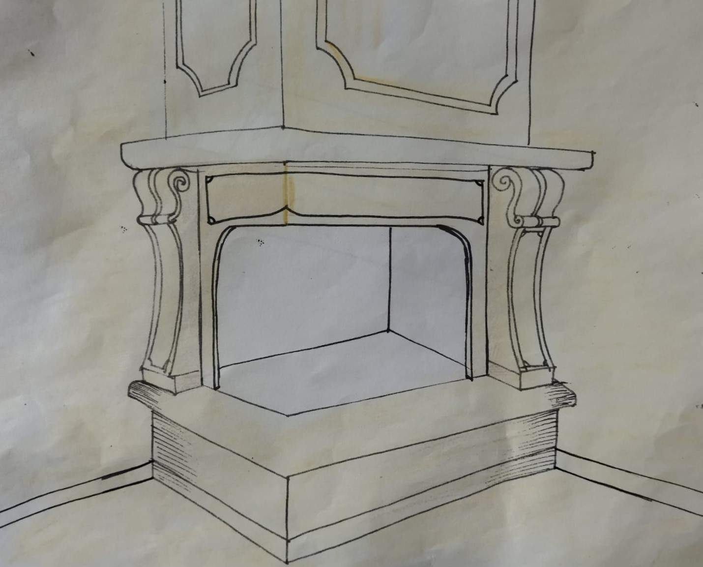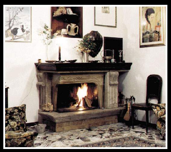Caminetto ad L in pietra di Trani bocciardata e levigata con colonne sagomate, architrave con stemma in rilievo su fondo scalpellato