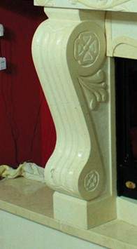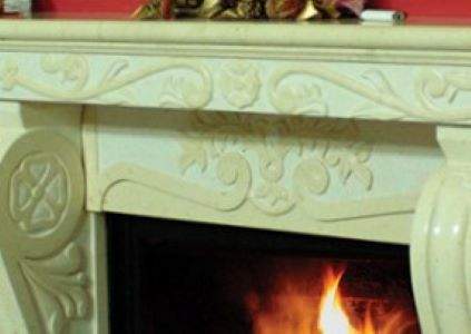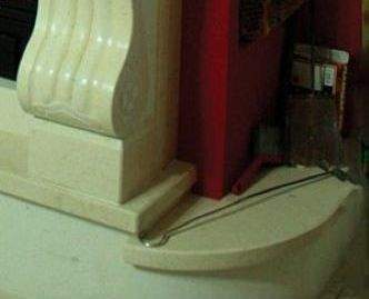 Rivestimento per caldaia su misura in pietra d'Apricena scalpellata e levigata con colonne sagomate e disegni a rilievo