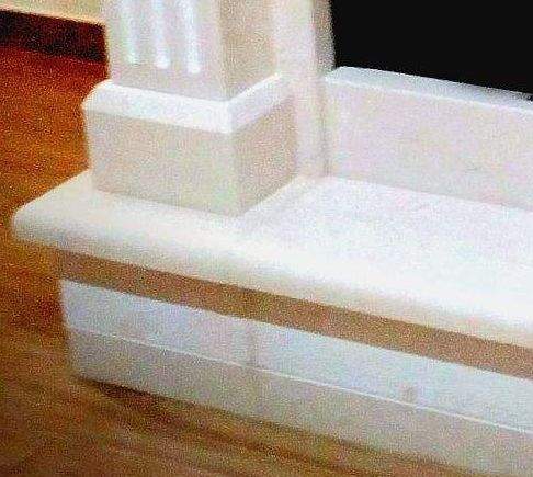 Rivestimento per caldaia su misura in pietra di Trani scalpellata e levigata, colonne con scanalature