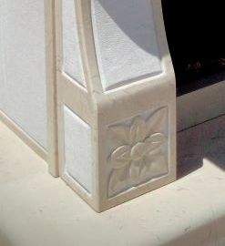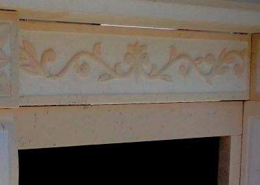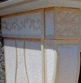 Caminetto in pietra di Trani scalpellata e levigata con colonne sagomate e disegni floreali a rilievo