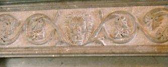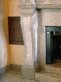 Rivestimento per caldaia su misura in pietra grigia locale scalpellata e levigata con colonne sagomate, architrave con disegno a rilievo su fondo scalpellato
