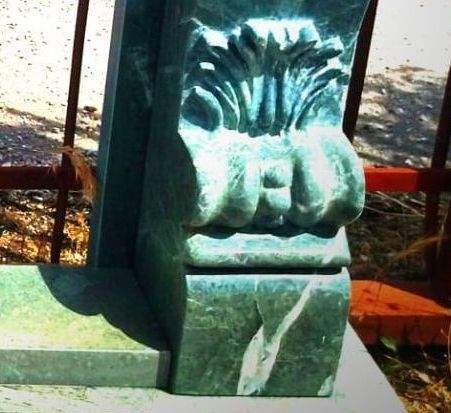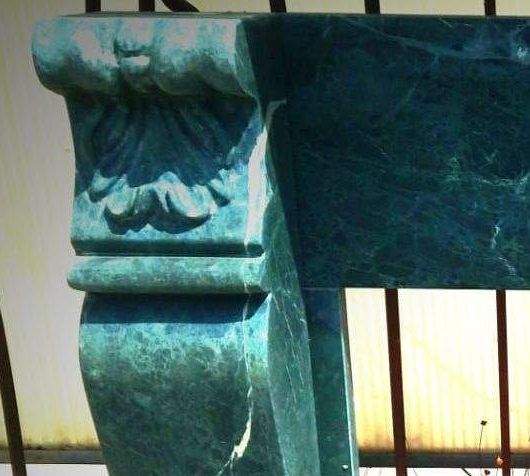 Caminetto in lavorazione, Verde Guatemala levigato con colonne sagomate e disegni in rilievo
