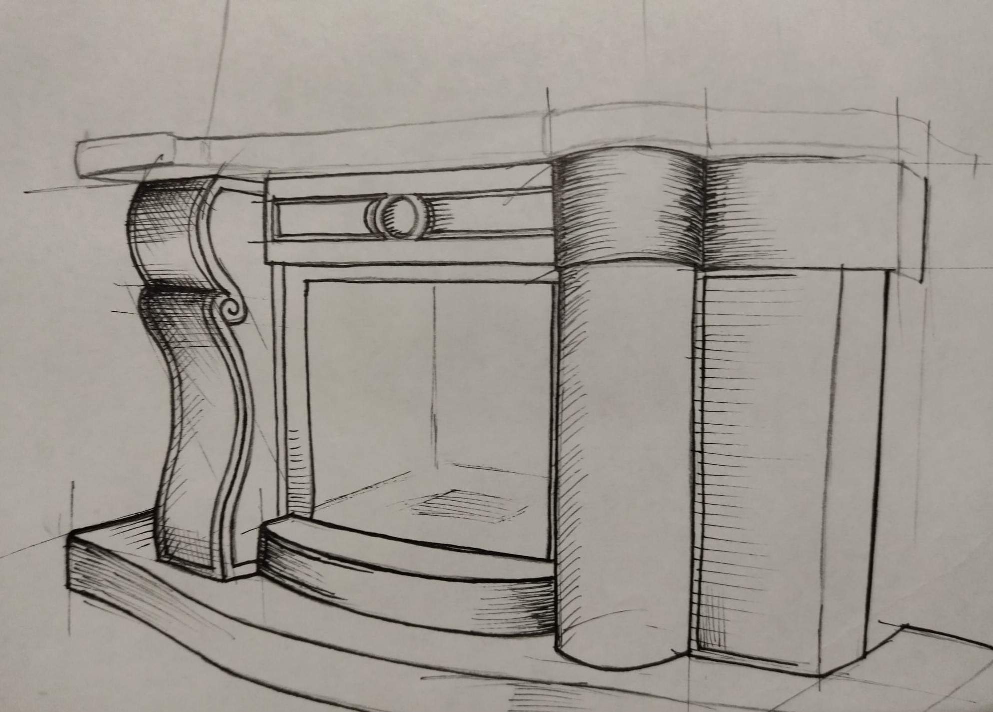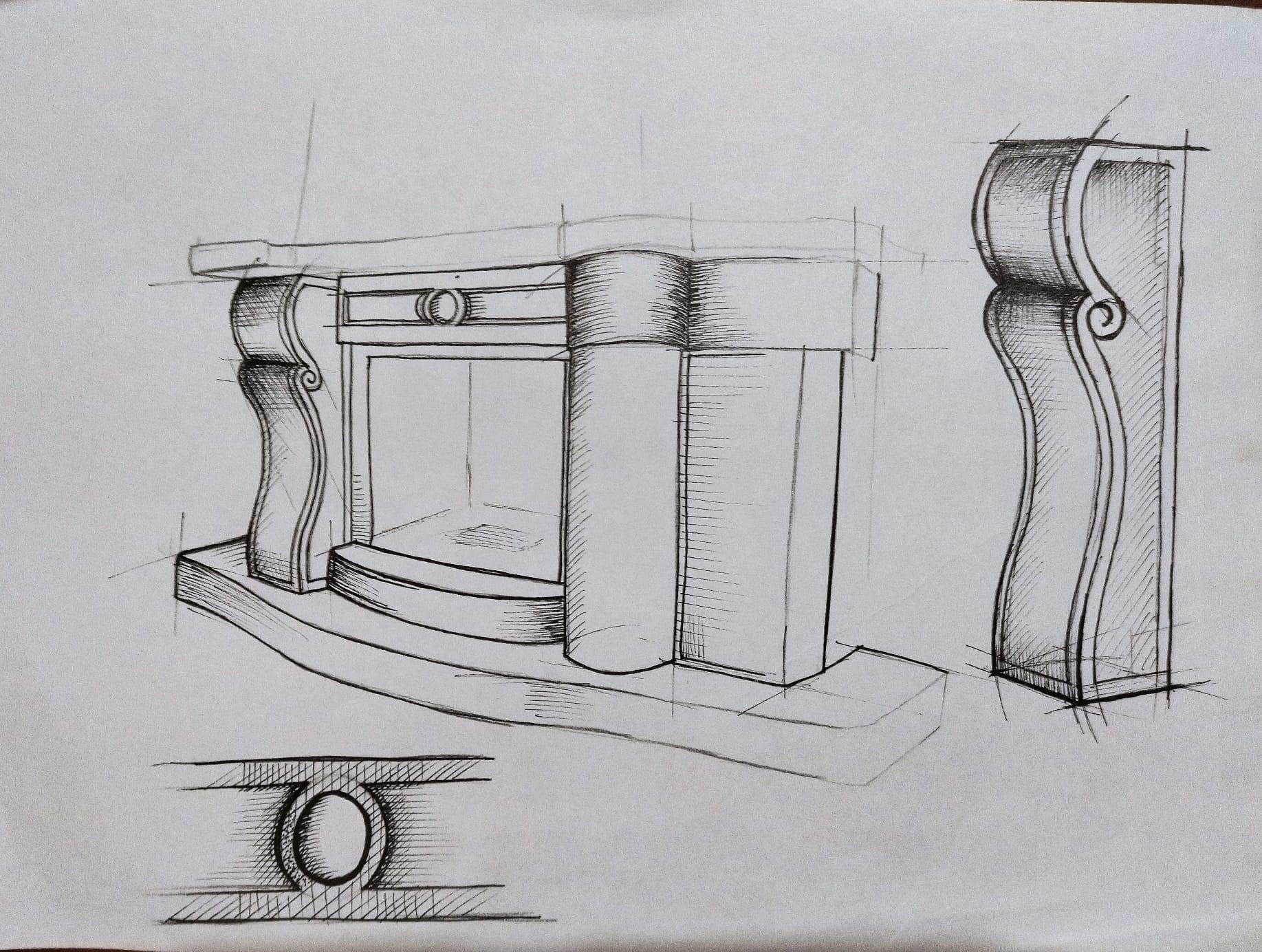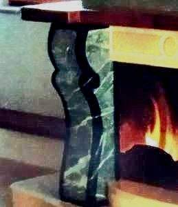 Caminetto in pietra d'Apricena levigata e scalpellata, con colonna e capitello in Verde Guatemala