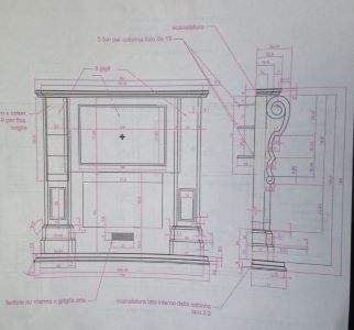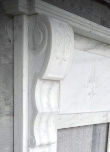Caminetto in marmo di Carrara scalpellata e levigata con colonne sagomate